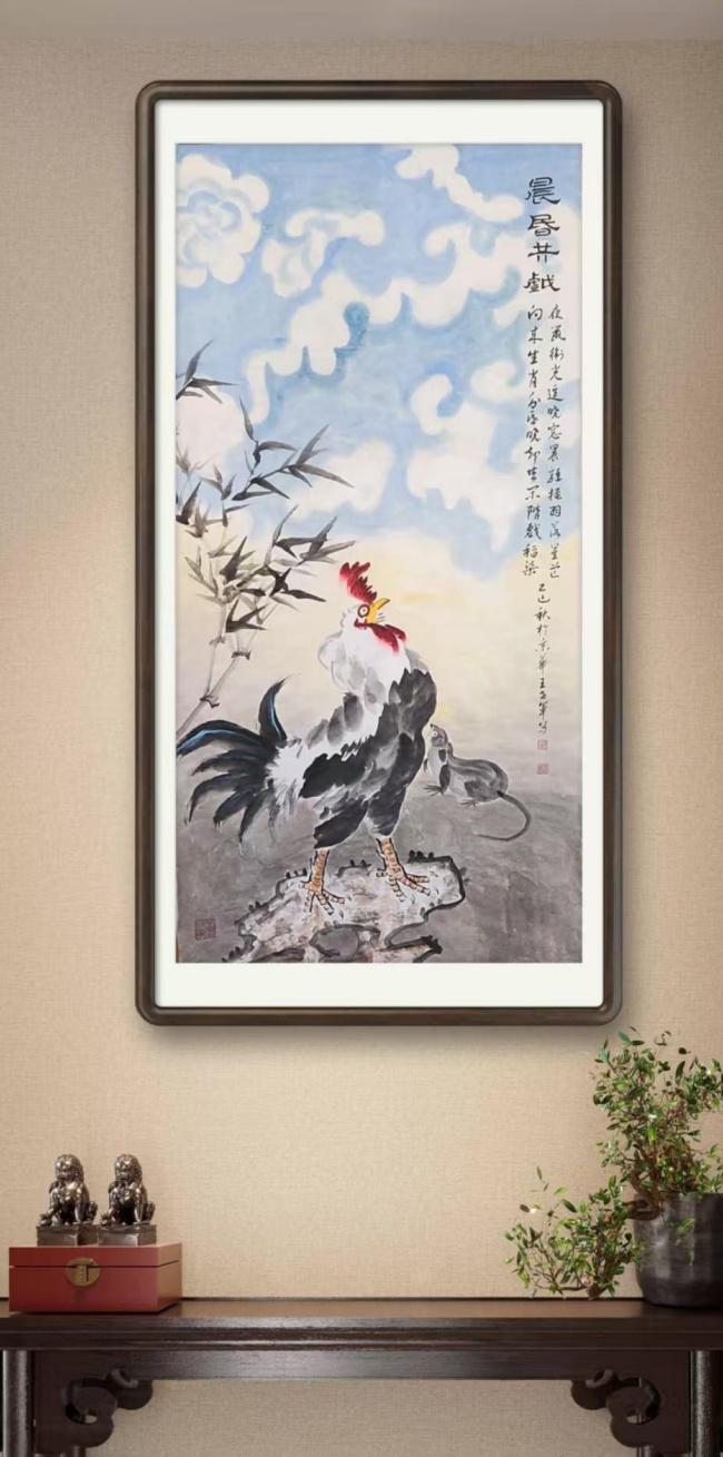 十二生肖系列国画《晨昏共戏》以“鸡”与“鼠”为切入点,通过意象重构、笔墨创新与构图突破,打破了传统生肖画的对立叙事与符号化表达。“晨昏”的时间轴线与“共戏”的情感内核,让两种分属昼夜的动物形成“共生”的默契,既保留了生肖文化的传统基因,又赋予其当代艺术的温度与思考。这种尝试,为生肖题材国画的创作提供了新的思路——以“情感”为纽带,让传统符号在当代语境下焕发新的生命力。