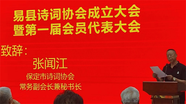 保定市诗词协会副会长张闻江高天民会长宣读了《保定市诗词协会的贺信》。贺信中写到:千年易县,人杰地灵,历史厚重,文脉流长。易县诗词协会秉承时代盛运,赓续文化传统,搭建起了全县诗词人之家,不仅是全县文化生活中的一件大事,也为保定乃至河北诗词事业增添了新生力量。协会的成立,必将对凝聚团体精神、陶冶人生性情、激励会员心志、促进社会经济文化建设都有着积极推动和建设作用,也必将进一步加快品质生活、品质易县建设步伐。
