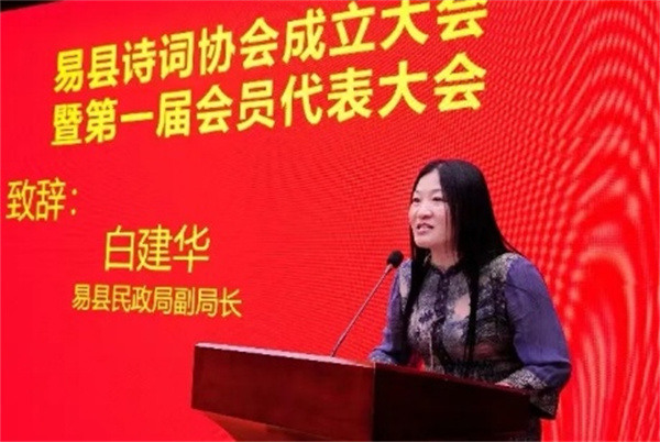 易县民政局副局长白建华讲话,她说,易县是联合国首批命名的千年古县,文化底蕴深厚,2534平方公里广袤的土地,8000多年人类文明史源远流长,300多处历史文化遗存,41处文明保护单位熠熠生辉,易县诗词协会的成立恰逢其时。她对诗词协会提出要求,并有“四点建议”,希望易县迈向诗词蓬勃发展的新征程。