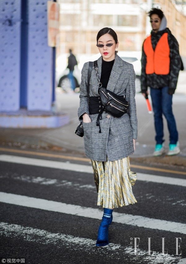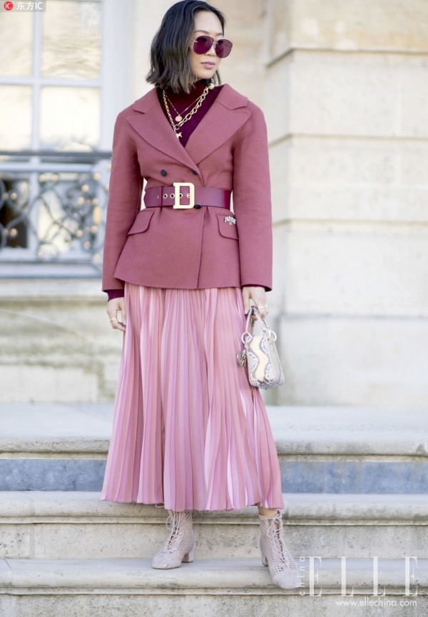 若想给西装+百褶裙这对CP加分,选择宽腰带或腰封就对了,轻松收敛西装的挺括勾勒出纤细腰身,也尽显修身干练。