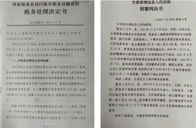 2025年6月26日,景泰三福粮油实际控制人王平涉及贪污、挪用公款、滥用职权、职务侵占、骗取贷款等多项罪名被靖远县人民法院判处有期徒刑二十年;景泰三福粮油法定代表人甘永义犯骗取贷款罪判处有期徒刑三年;景泰三福粮油公司犯骗取贷款罪,判处罚金十万元。