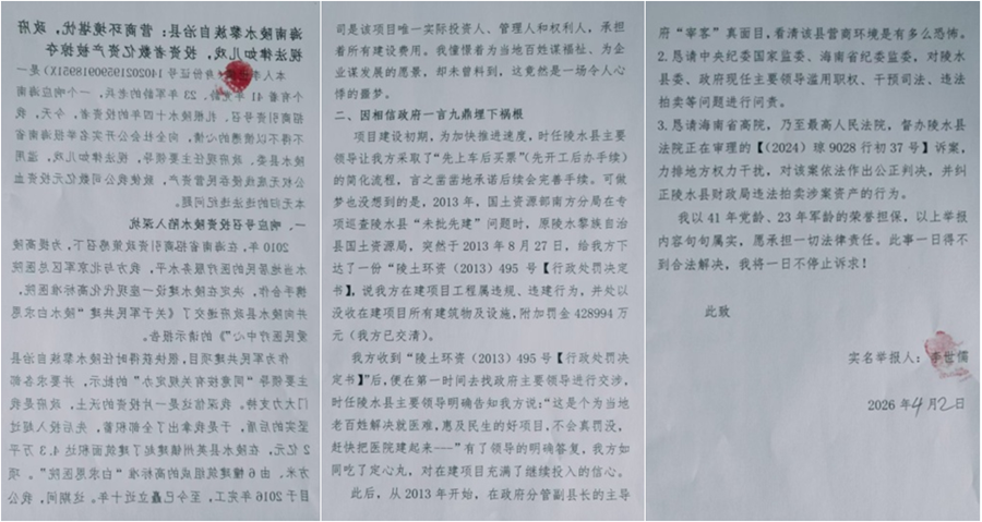 本人李世儒(身份证号14020219590918951X)是一个有着41年党龄、23年军龄的老兵,一个响应海南招商引资号召、扎根陵水十四年的投资者。今天,我不得不以愤懑的心情,向全社会公开实名举报海南省陵水县委、政府现任主要领导,视法律如儿戏,滥用公权无底线侵吞民营资产,致使我公司数亿元投资血本无归的违法违纪问题。